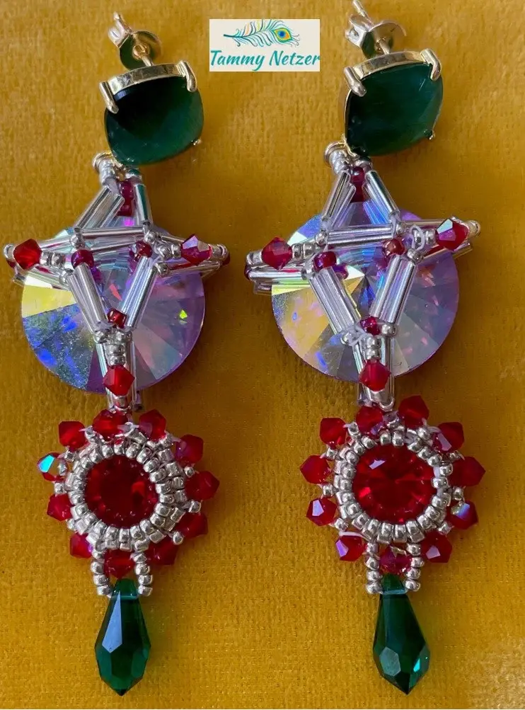 Long Christmas earring, Red green crystals earring, Drop earrings